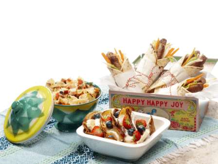 Maak een buideltje door de pannenkoekjes in vieren te vouwen, schep er een lepel vanillekwark in met daarbovenop banaan, blauwe bessen en aardbeien.