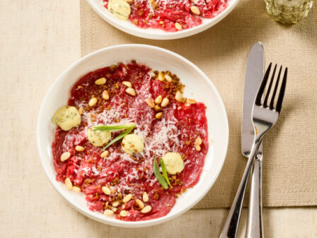 Carpaccio met pecorino, mosterd-dragonmayonaise en roggenbroodcrumble
