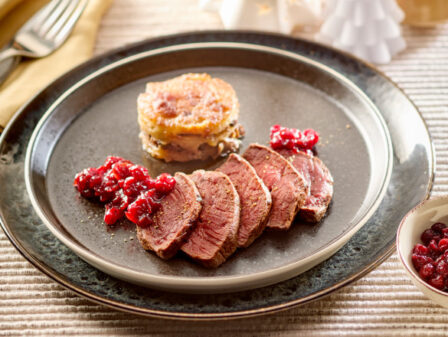 Hertenbiefstuk met aardappel-paddenstoelen- gratin en cranberrycompote
