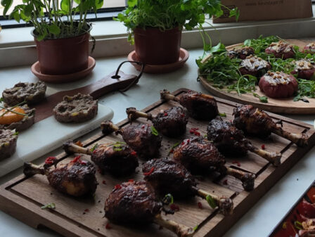 - Verwarm de barbecue tot 160°C. Snijd de onderkant van de drumsticks los en schraap de botjes schoon.