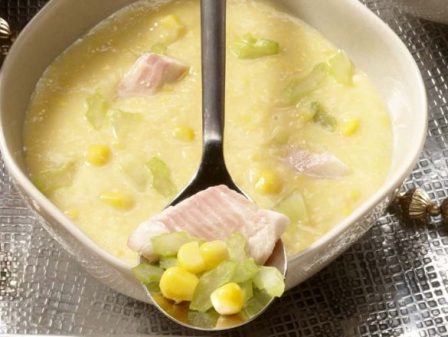 Stoof de ui, selderij en prei in de boter. Voeg er de mais en bloem aan toe en meng goed. Giet de bouillon erbij en laat dit 20 minuten zachtjes koken.