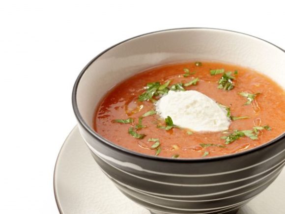 Zacht gestoofde trostomatensoep met zure room en kruiden