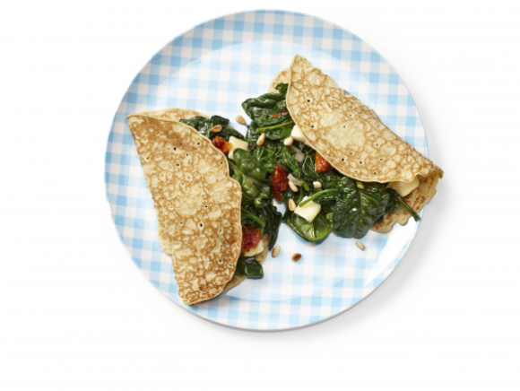 Vegetarische pannenkoek met spinazie en pijnboompitten