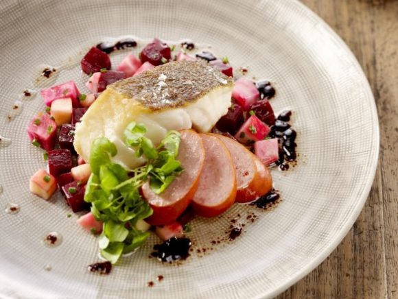 Salade van rode bietjes met gebakken kabeljauw en balsamicoazijn