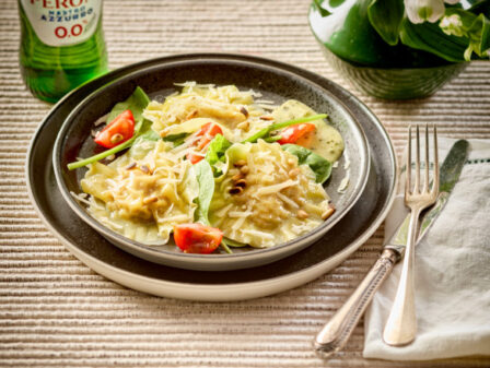 - Breng een grote pan met water met zout aan de kook en kook maximaal 4 ravioli ’s per keer in 3 tot 4 minuten gaar. Schep ze met een schuimspaan uit de pan en leg ze in de schaal in de oven totdat alle ravioli klaar is.