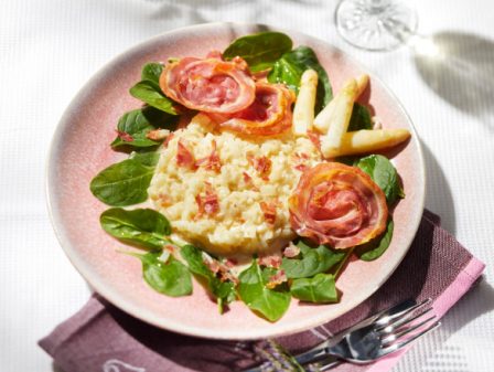 - Leg een kookring van 10 cm doorsnede op voorverwarmde borden en schep hier de aspergerisotto in. Verdeel de spinazieblaadjes en de pancetta over het bord.