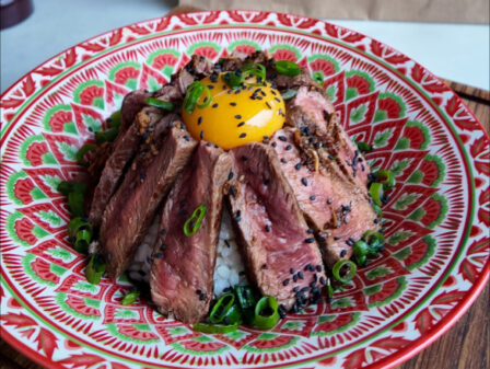Steak Donburi: Japanse rijstkom met biefstuk & sticky sojasaus