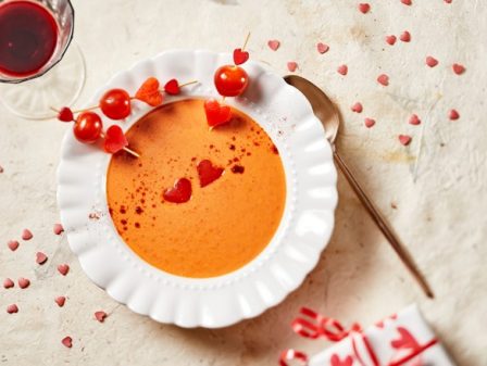 - Rijg aan een spies 1 tomaatje en 1 uitgestoken hartje van paprika en serveer de spies in de soep.