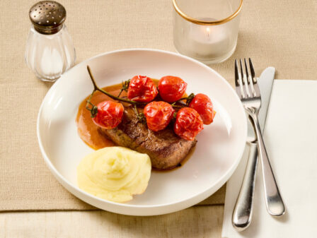 u005cu003colu005cu003e u005cu003cliu005cu003eSmelt de roomboter in een steelpan en fruit de ui glazig. Voeg de Madeira toe en laat het iets inkoken.u005cu003c/liu005cu003e u005cu003cliu005cu003eDoe de fond erbij en laat het geheel voor een derde inkoken.u005cu003c/liu005cu003e u005cu003cliu005cu003eVerhit in een koekenpan de olijfolie en bak de tournedos aan twee kanten fel aan. Leg ze op een rooster en bak ze in een voorverwarmde oven van 85u005cu0026deg; C tot een kerntemperatuur van 48u005cu0026deg; C. Dit duurt ongeveer 20 minutenu005cu003c/liu005cu003eu005cu003c/olu005cu003eu005cu003cpu005cu003eu005cu003cstrongu005cu003eAardappel-citroenmousselineu005cu003c/strongu005cu003eu005cu003c/pu005cu003eu005cu003colu005cu003e u005cu003cliu005cu003eVoeg wat zout aan de aardappelen toe en kook ze gaar. Giet deze af en stamp ze fijn.u005cu003c/liu005cu003e u005cu003cliu005cu003eRoer de boter en olijfolie door de puree.u005cu003c/liu005cu003e u005cu003cliu005cu003eVerwarm de melk en de slagroom en schenk hiervan zoveel bij de puree totdat deze mooi glad en enigszins dik vloeibaar is. Breng het geheel op smaak met peper en zout. u005cu003c/liu005cu003eu005cu003c/olu005cu003eu005cu003cpu005cu003e u005cu003c/pu005cu003eu005cu003cpu005cu003eu005cu003cstrongu005cu003eHarissa-tomaatjesu005cu003c/strongu005cu003eu005cu003c/pu005cu003eu005cu003culu005cu003e u005cu003cliu005cu003e750 g cherrytomaatjesu005cu003c/liu005cu003e u005cu003cliu005cu003e2 el olijfolieu005cu003c/liu005cu003e u005cu003cliu005cu003e el harissau005cu003c/liu005cu003eu005cu003c/ulu005cu003e