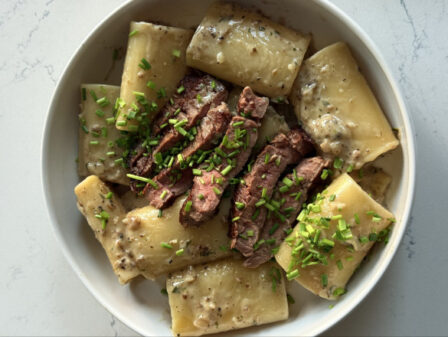 - Snijd de biefstuk in dunne plakjes en leg deze bovenop de pasta.