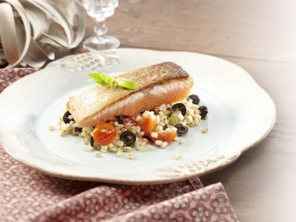 Leg de blokjes zalm in voorverwarmde borden, giet er de schuimige soep omheen. Snijd de komkommer in dikke plakken, leg er wat creme fraiche op en garneer dit met de zalmeitjes.