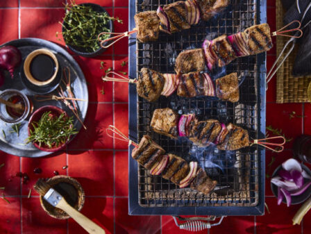 - Grill de steakspiesjes in 3 minuten per kant tot ze mooi gekaramelliseerd zijn en vanbinnen rosé.